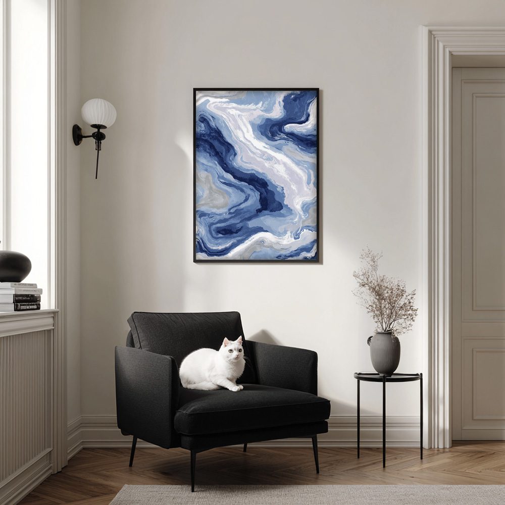 Blue Flow Poster är en abstrakt poster där djupa blå nyanser möter mjuka sand- och gråtoner i ett levande flöde. De svepande formerna skapar en känsla av rörelse och djup, inspirerad av havets dynamik och naturliga marmoreringar.