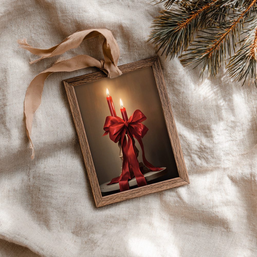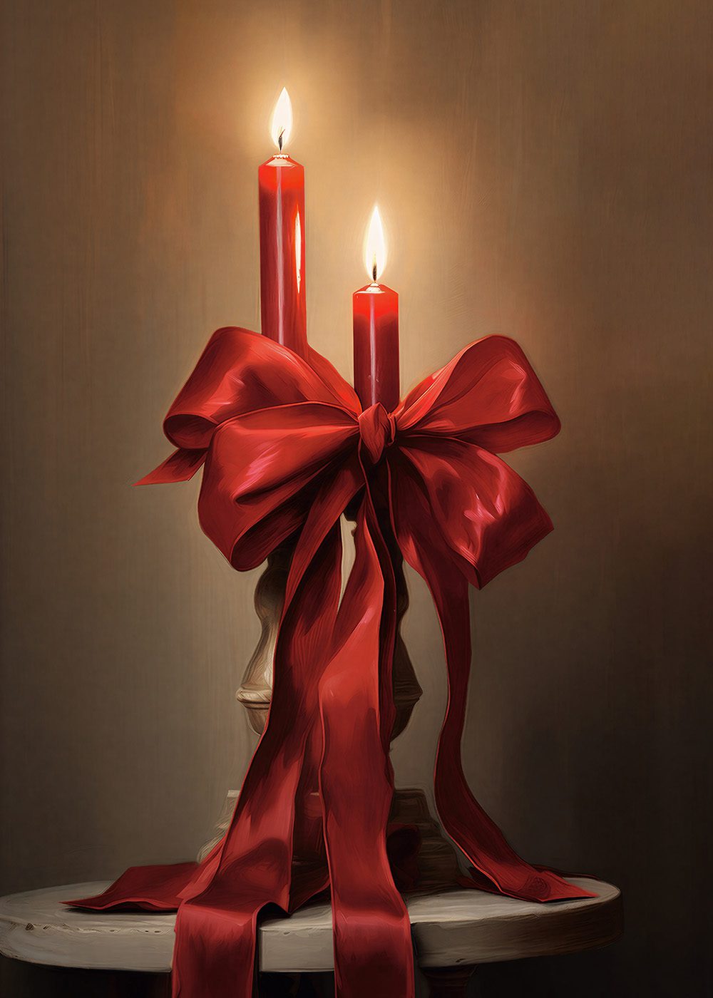 Skapa en varm och lyxig julstämning med denna eleganta poster föreställande två röda ljus bundna med en magnifik sidenrosett. Den dova bakgrunden lyfter fram ljusens glöd och ger motivet en stämningsfull och klassisk känsla. Perfekt för julmys, adventsdekorationer eller som ett stilfullt inslag på en tavelvägg med traditionella vintermotiv. En sofistikerad och tidlös julposter.