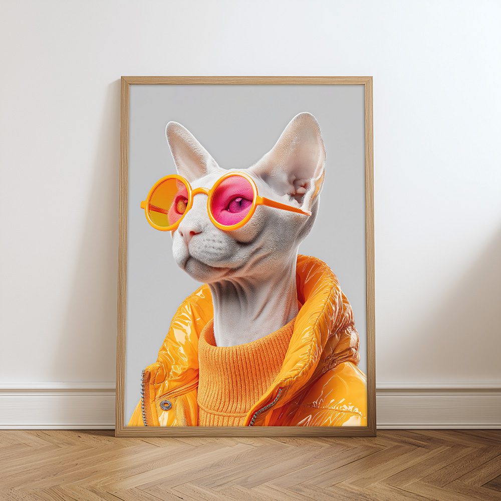 Cool Sphynx Street Style är en poster som andas självsäkerhet, mode och urban attityd. Den karaktärsfulla sphynx-katten, klädd i färgstarka glasögon och modern jacka, ger ett uttryck som för tankarna till street fashion, designmagasin och kreativa storstadsmiljöer. Färgvalet är energiskt men balanserat, vilket gör den lätt att kombinera med både neutrala och färgstarka inredningsstilar.