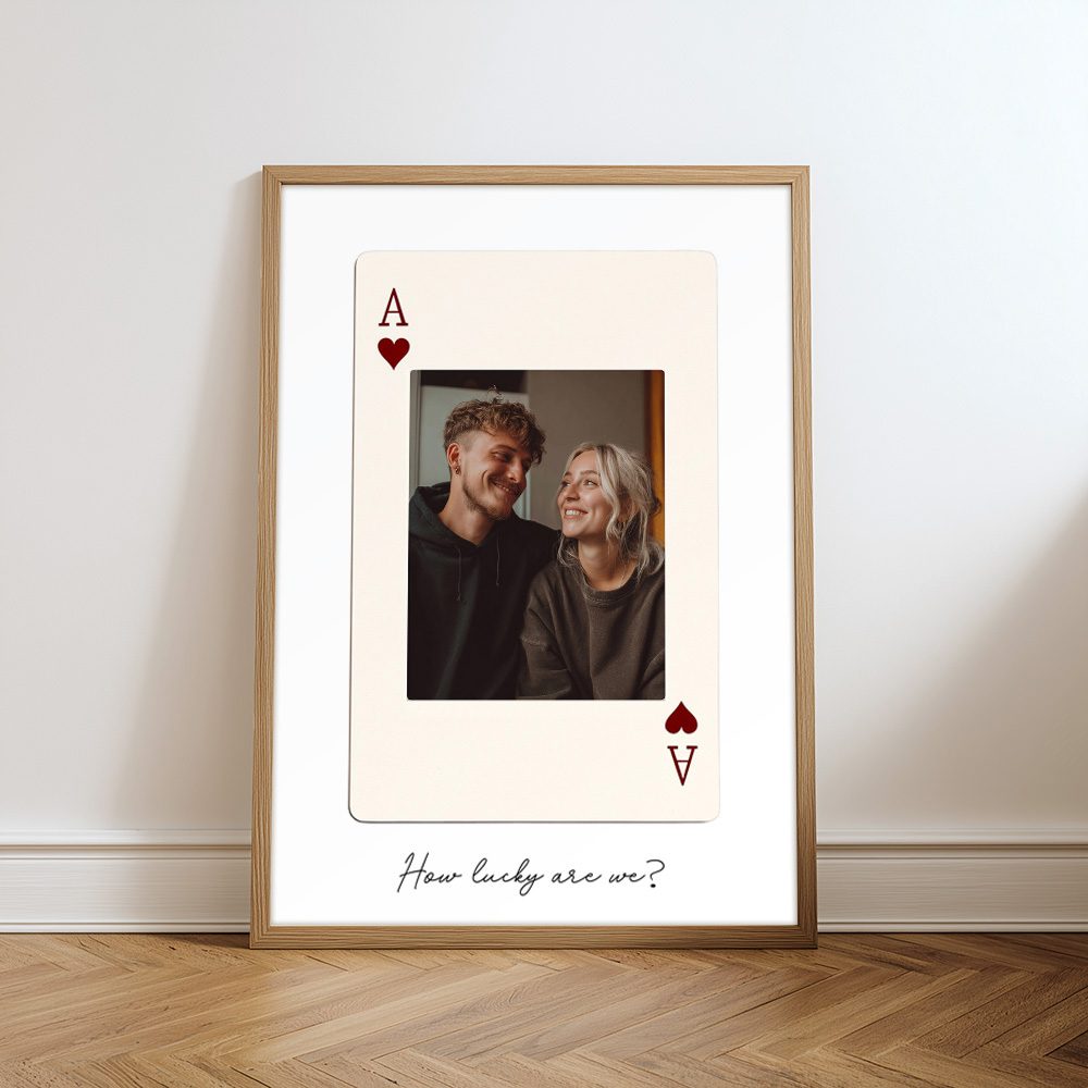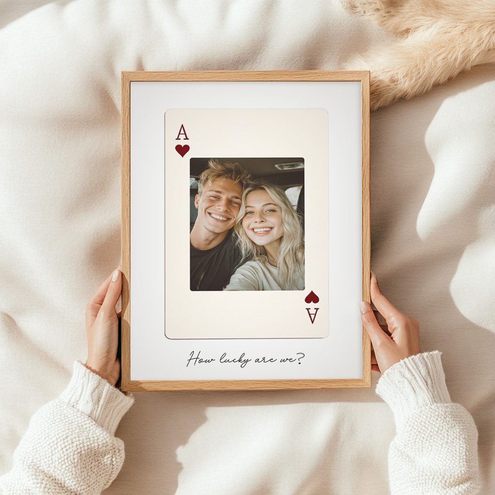 Denna personliga poster låter dig skapa ett unikt och emotionellt konsttryck med ditt eget foto, presenterat i en stilren design inspirerad av klassiska spelkort. Perfekt för att lyfta fram kärlek, relationer och minnen som betyder något extra. Du laddar enkelt upp ditt eget foto och väljer mellan flera färdiga titlar eller skriver din egen text för ett helt personligt uttryck. Resultatet blir en tidlös poster som passar lika bra som present som i ditt eget hem. Postern är ett populärt val till bröllop, Alla hjärtans dag eller som en personlig detalj i sovrum eller vardagsrum.