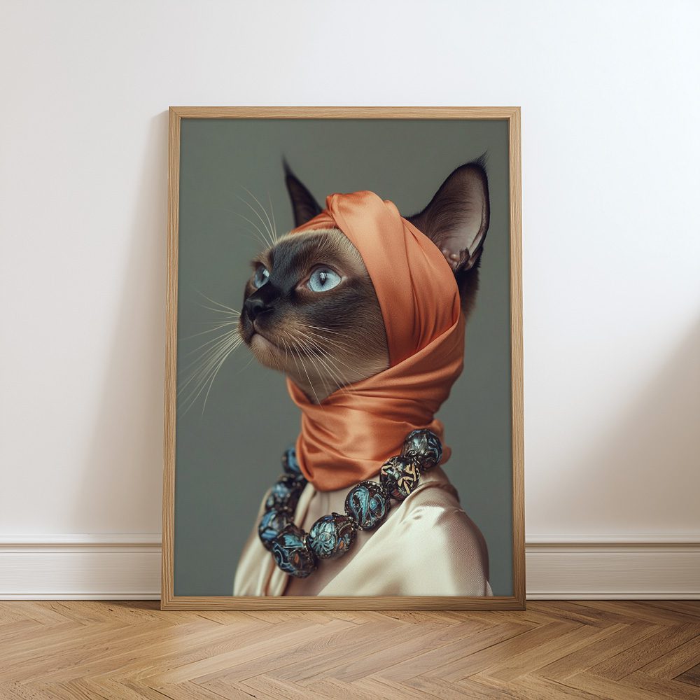 Fashion Icon Siamese är en poster som kombinerar klassisk skönhet med modern modekänsla. Den siamesiska katten bär en elegant scarf och smycken som ger ett exklusivt och sofistikerat uttryck. Ett motiv som förmedlar styrka och stil. Denna poster är ett utmärkt val för modeintresserade, designälskare och alla som vill addera en subtil känsla av lyx till sin inredning. Passar perfekt i stilrena hem, garderober eller kreativa arbetsmiljöer.