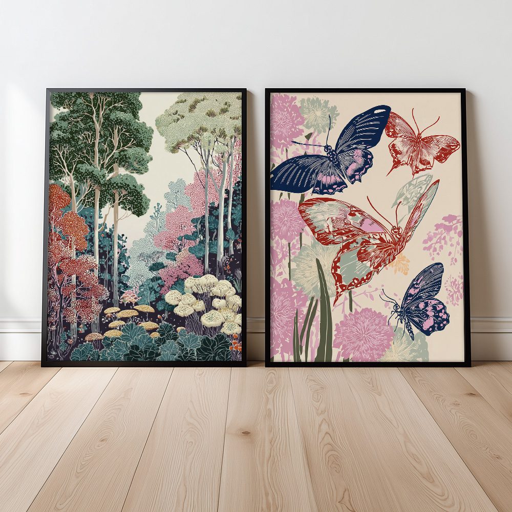 Fjärilar & Blommor Poster är en dekorativ affisch som fångar eleganta fjärilar bland blommande växter i harmoniska och livfulla färger. Kombinationen av djupa blå toner, varma röda nyanser och mjuka rosa blommor skapar ett konstnärligt motiv med botanisk känsla. Denna poster ger ditt rum en levande och stilren atmosfär och passar utmärkt i vardagsrum, sovrum eller kreativa miljöer.