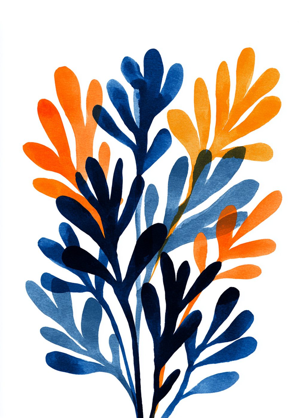 En energifylld poster med grafiska bladformer i djupblått och varm orange. Den starka färgkontrasten skapar ett modernt statement som livar upp både vardagsrum och arbetsrum.