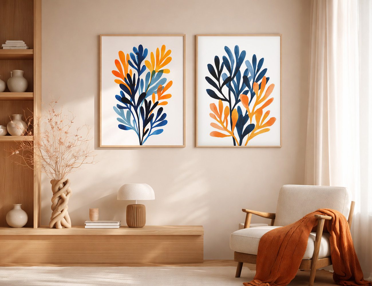 En stilren botanisk poster där blå och orange bladformer samspelar i en modern komposition. Perfekt för dig som vill addera färg utan att kompromissa med en elegant och balanserad känsla.