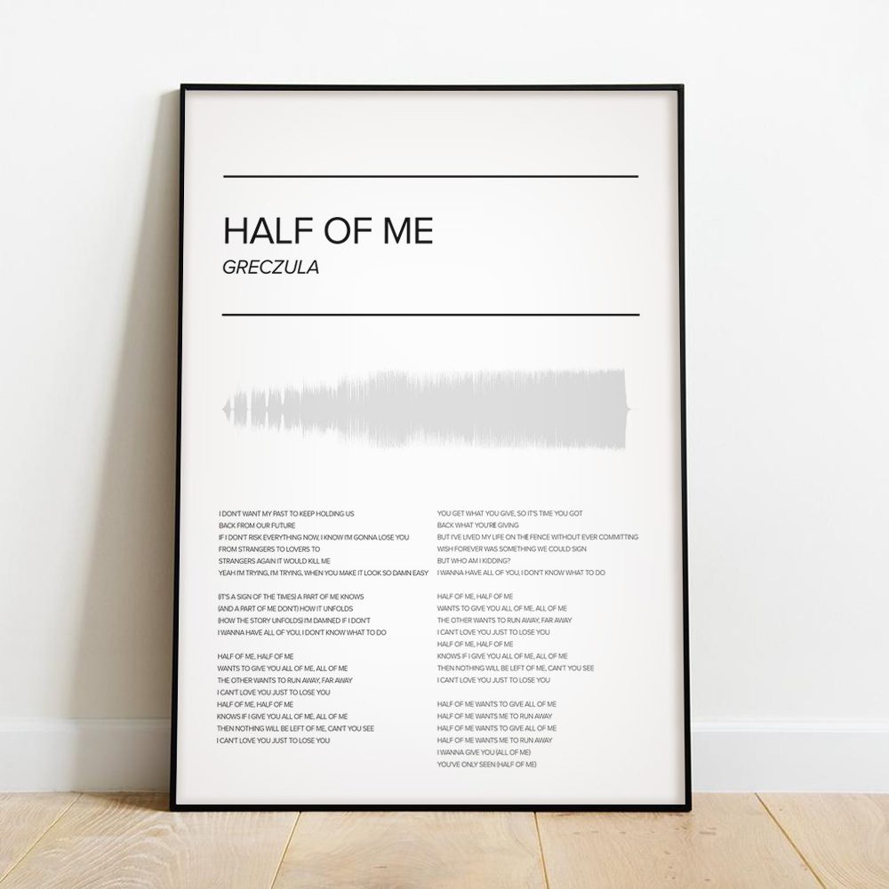 Denna stilrena poster med låttexten ”Halv of Me” av Greczula är en perfekt kombination av minimalistisk design och djup känsla. Med elegant svart typografi och en subtil grafisk ljudvåg i ljusgrått, erbjuder denna affisch en tidlös och emotionellt laddad konstupplevelse.