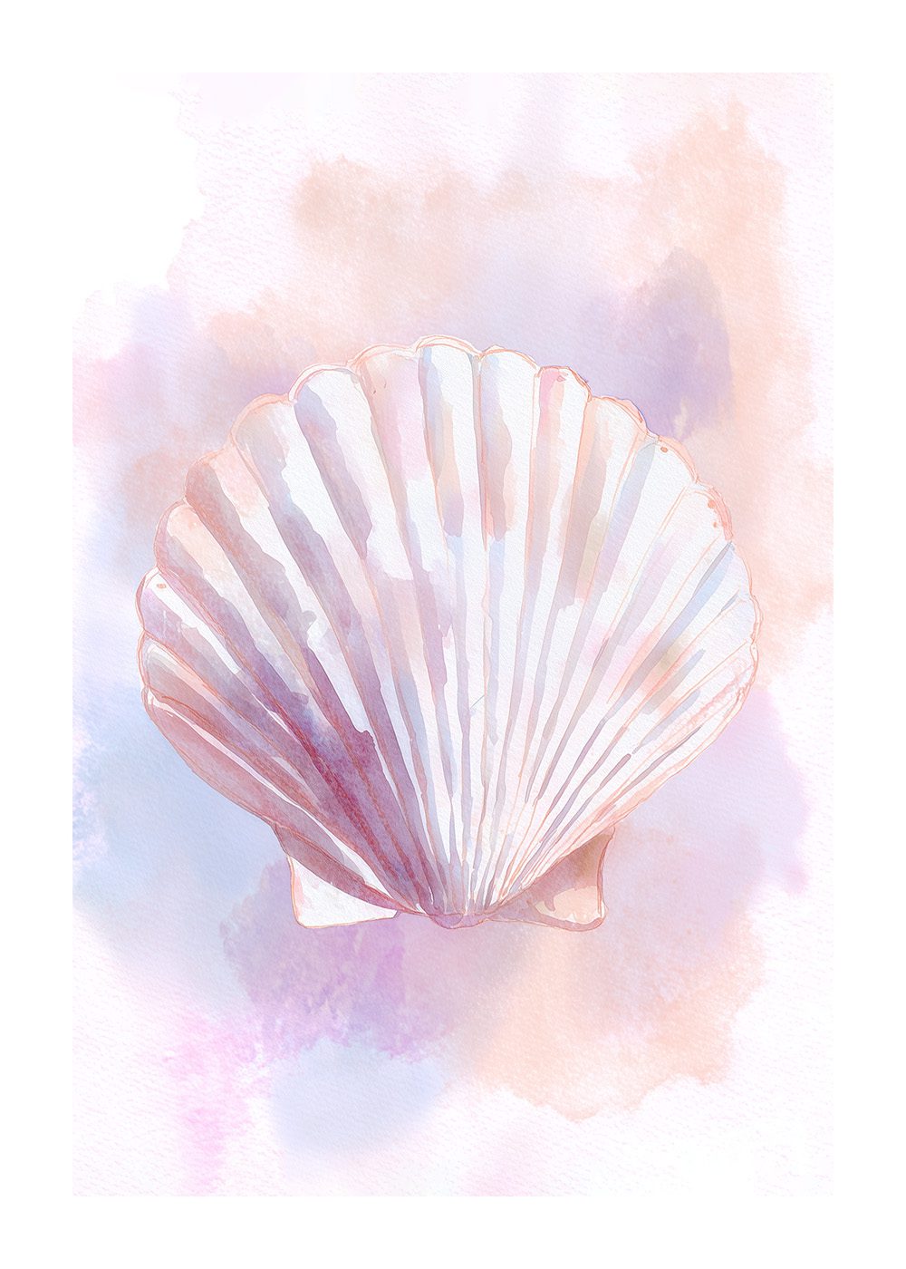 Pastell Snäcka no2 är en romantisk akvarellposter med en söt mussla i rosa och lila toner. Perfekt för trendiga och neutrala barnrum med havstema.
