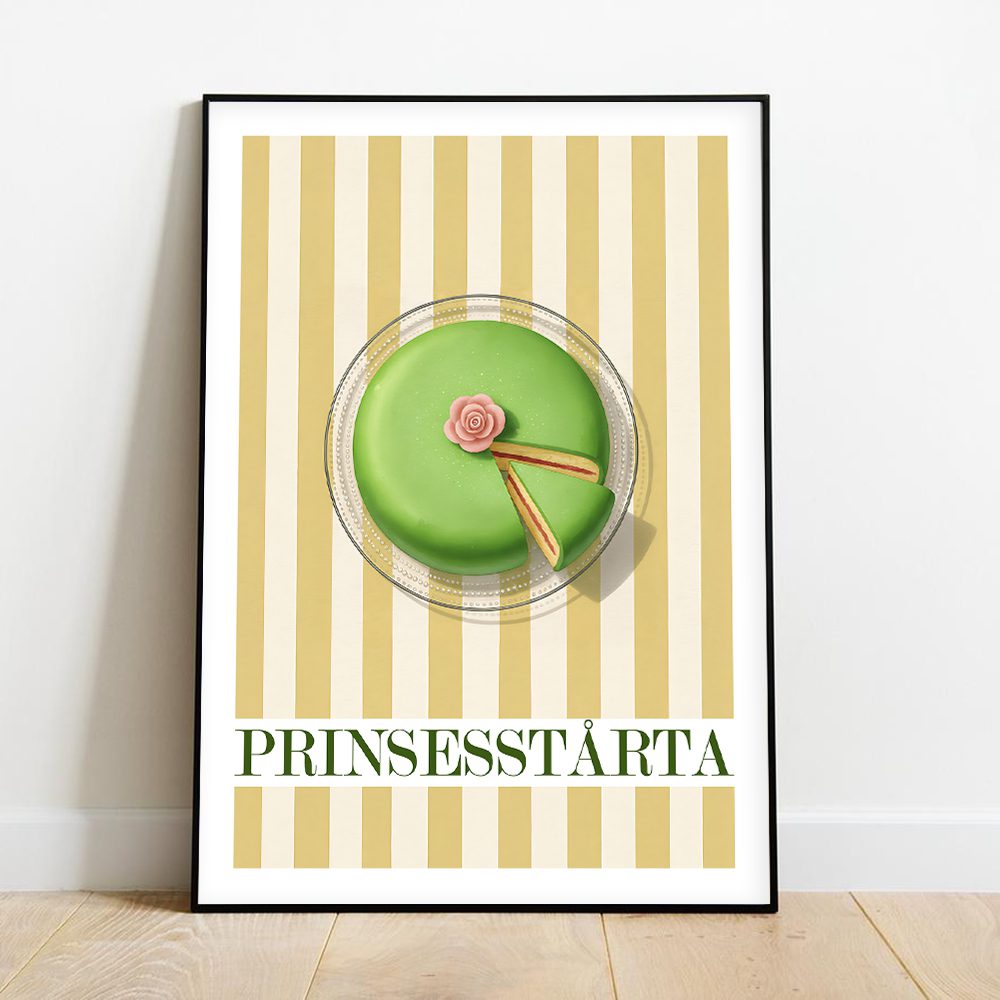 Fördjupa dig i den söta nostalgin med denna vackra poster, inspirerad av den klassiska prinsesstårtan. Den gröna marsipanen, den rosa rosen och de mjuka tonerna skapar en harmonisk känsla av både tradition och modern elegans.