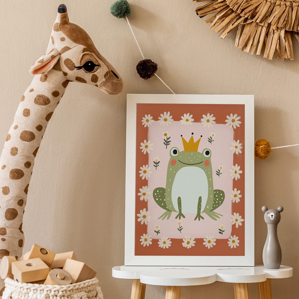 Retro Frog Prince Poster erbjuder en sagolik touch till ditt barns rum. Denna charmiga poster, med en kronprydd groda omgiven av blommor, är idealisk för att skapa en lekfull och inspirerande miljö. Med sina retrofärger och illustrationer blir den snabbt en favorit i barnrummet.