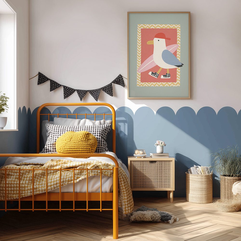 Denna Retro Skater Seagull Poster är en humoristisk och färgglad söt poster till barnrum med en mås i skateboard-stil. Den är utformad för att ge energi och glädje i barnets rum. Med sina lekfulla retrofärger och illustrationer blir den en perfekt touch till varje barnrum.