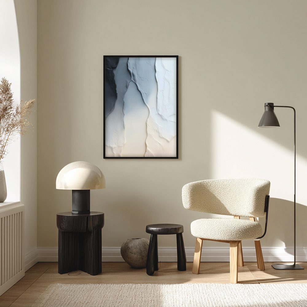 Soft Layers är en minimalistisk poster uppbyggd av mjuka, organiska lager i dämpade beige, grå och ljusa blå toner. De subtila övergångarna skapar ett lugnt, nästan taktilt uttryck som förmedlar harmoni och stillhet.