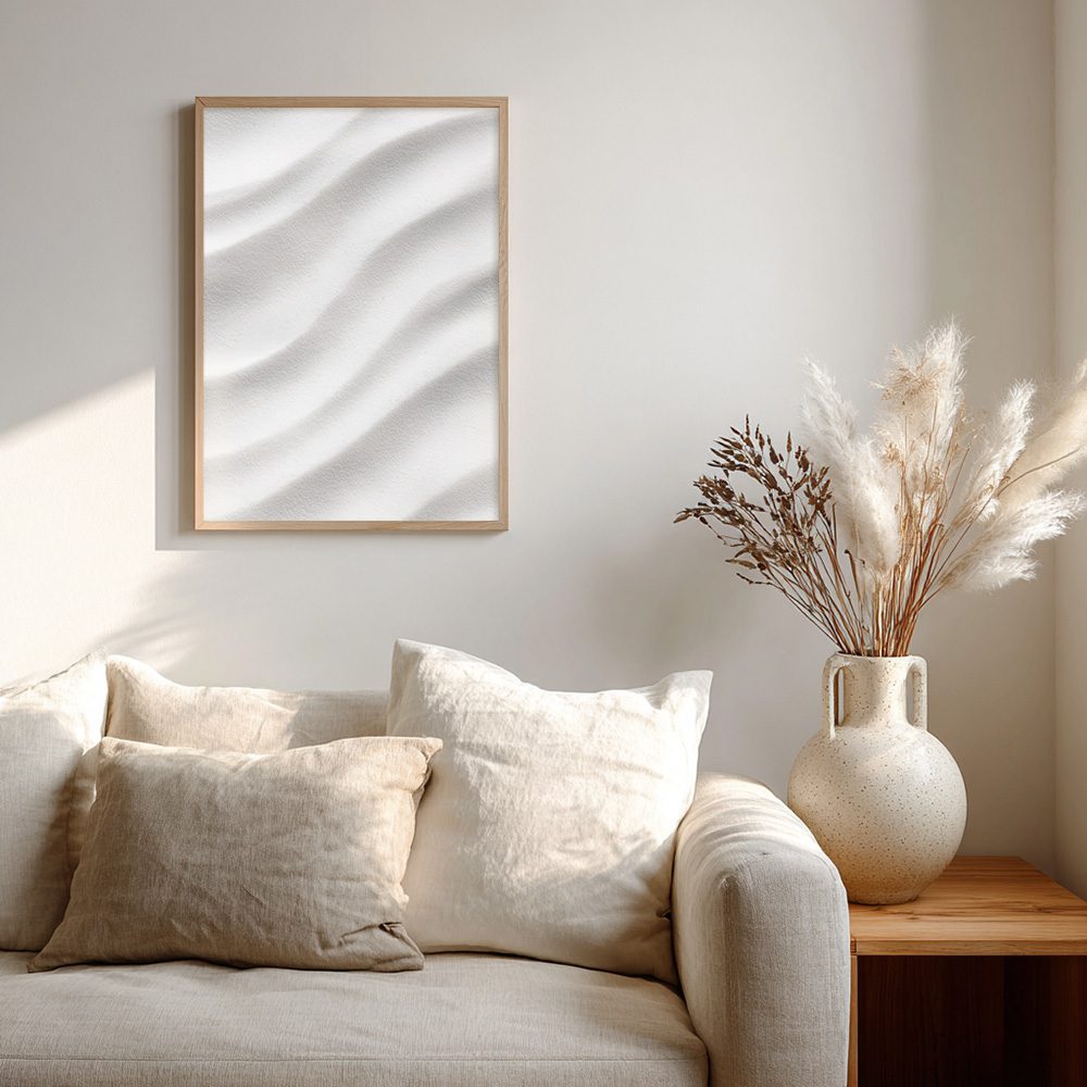 Inspirerad av vindformade sanddyner med mjuka vågformer i vitt. En rogivande poster som tillför balans och naturlig elegans till rummet.