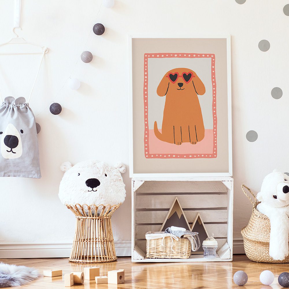Denna Retro Cool Dog Poster med hjärtformade solglasögon är en charmig och färgglad barnposter. Perfekt för att ge barnrummet en personlig och retro stil.