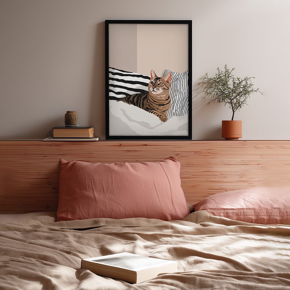 Striped Pillow Cat är en lugn och balanserad poster där katten vilar mot grafiska, randiga textilier. Ett rent och modernt motiv som passar perfekt i skandinaviska hem. Illustrationen fungerar både som ensam poster och i en tavelvägg.