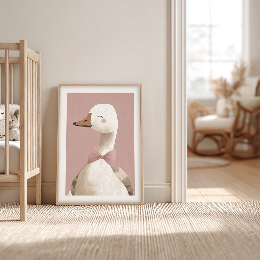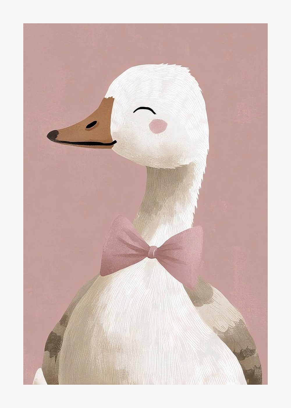 Sweet Goose är en mjuk och charmig barnposter som fångar hjärtat med sin söta gås prydd med en dekorativ rosett. Motivet förmedlar en känsla av värme och lugn, samtidigt som det för in en lekfull sagokänsla i baby- och barnrum.
