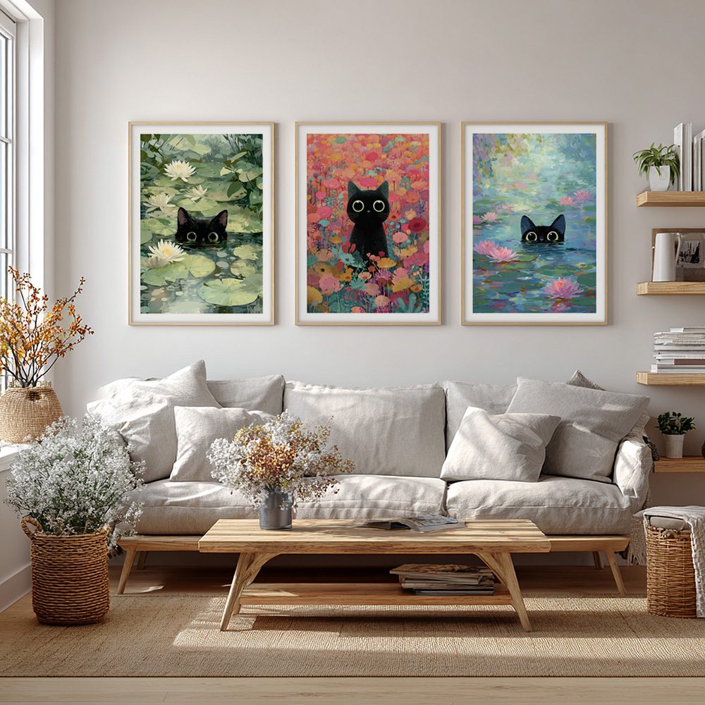En poetisk poster där endast kattens huvud syns ovanför vattenytan, omgiven av näckrosor och mjuka reflektioner. Motivet skapar en känsla av lekfull mystik och lugn rörelse. Den impressionistiska stilen gör postern till ett konstnärligt inslag som passar både moderna och klassiska miljöer.