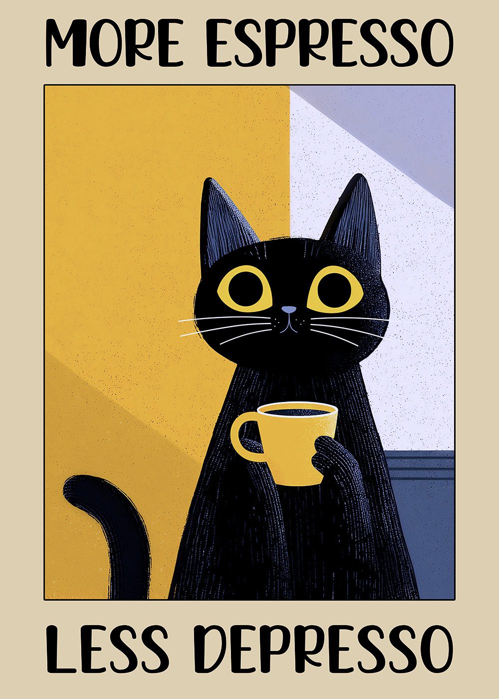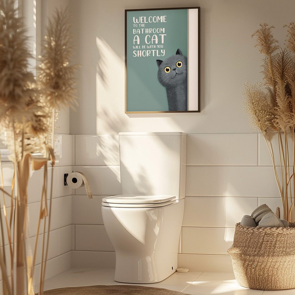 Den här postern är skapad för badrum där humor och personlighet får ta plats. Den nyfikna katten som tittar fram tillsammans med texten “A Cat Will Be With You Shortly” skapar ett varmt och lekfullt välkomnande. Den lugna färgskalan gör postern lätt att kombinera med skandinavisk, modern eller retroinredning. Ett perfekt val för kattälskare som vill ge även badrummet en personlig touch.