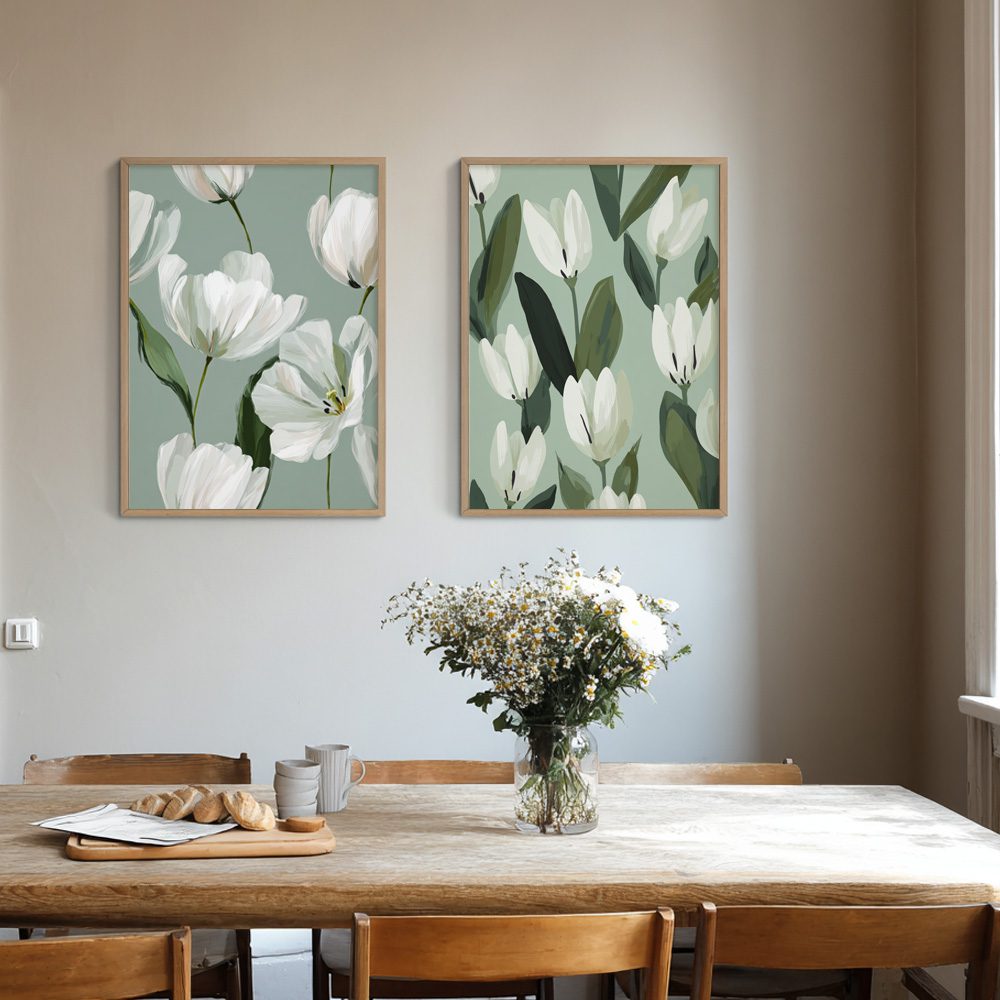 En mjuk och romantisk poster med vita tulpaner mot en dämpad salviagrön bakgrund. Motivet förmedlar vårkänsla, lugn och elegans – perfekt för sovrum, kök eller vardagsrum i nordisk stil.