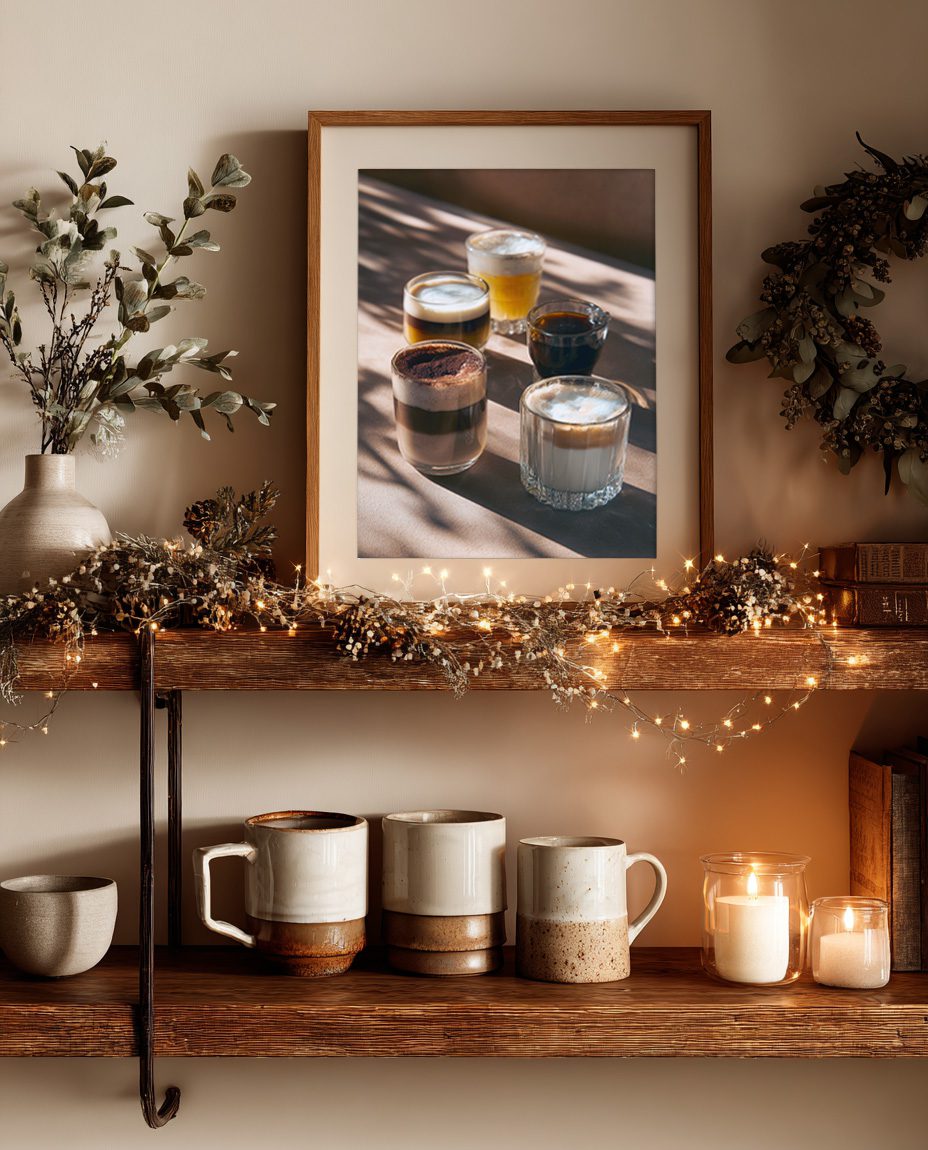 En varm och inbjudande poster som visar fyra olika kaffedrycker upplysta av mjuk vintersol. Perfekt för kök, caféhörna eller för alla som älskar kaffe och vill skapa en mysig vinterkänsla hemma.
